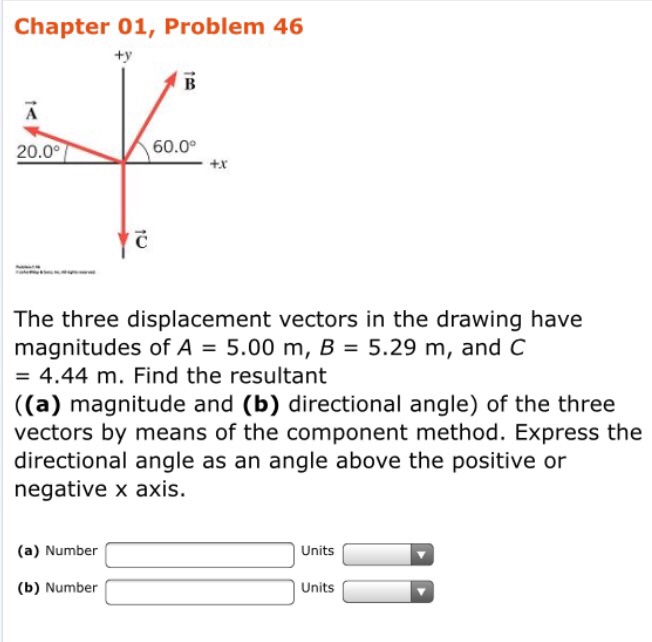 46 The Three Displacement Vectors In The Drawing Have Magnitudes Of A 5 00 M B 5 00 M And C 4 00 M Find The Resultant Magnitude And Directional Angle Of The Three Vectors By Means Of The Component Method Express The Directional Angle As An